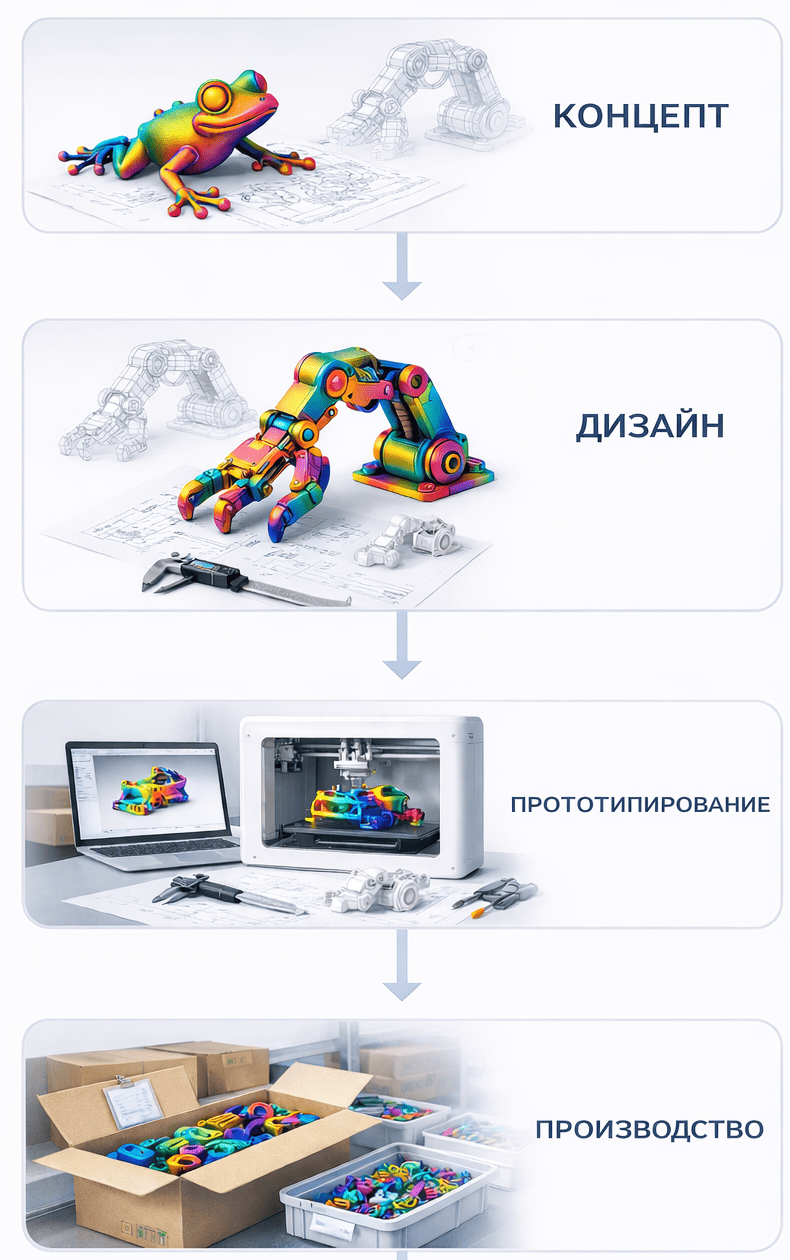 Мы – инженеры, дизайнеры и технологи, объединенные верой в то, что сложные идеи должны легко становиться реальностью. Наша миссия — быть полным циклом поддержки для инноваций: от первой цифровой модели до серийного продукта в руках у конечного пользователя.